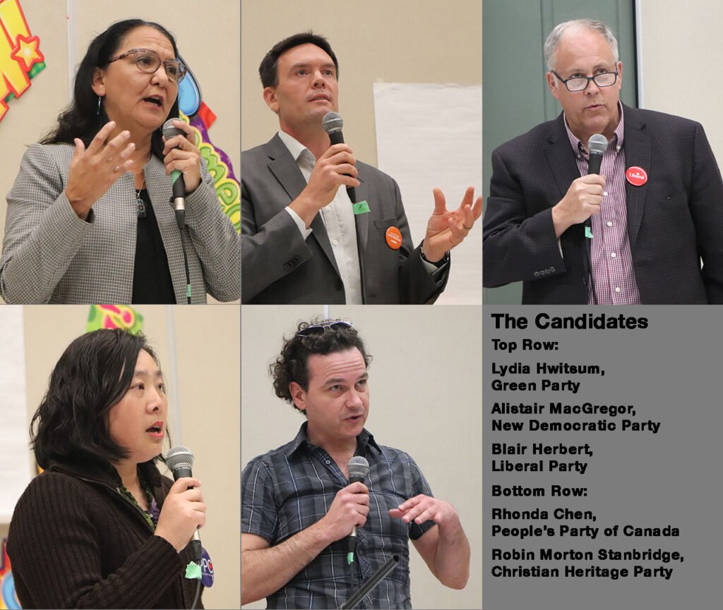 At the tables were: Blair Herbert of the Liberal Party; Lydia Hwitsum, Green Party; Alistair MacGregor, NDP; Robin Morton Stanbridge, Christian Heritage Party; and Rhonda Chen, People’s Party of Canada. The candidates were invited to make their opening and closing statements, and respond to questions from the audience in random order, by Moderator Tom Andrews.